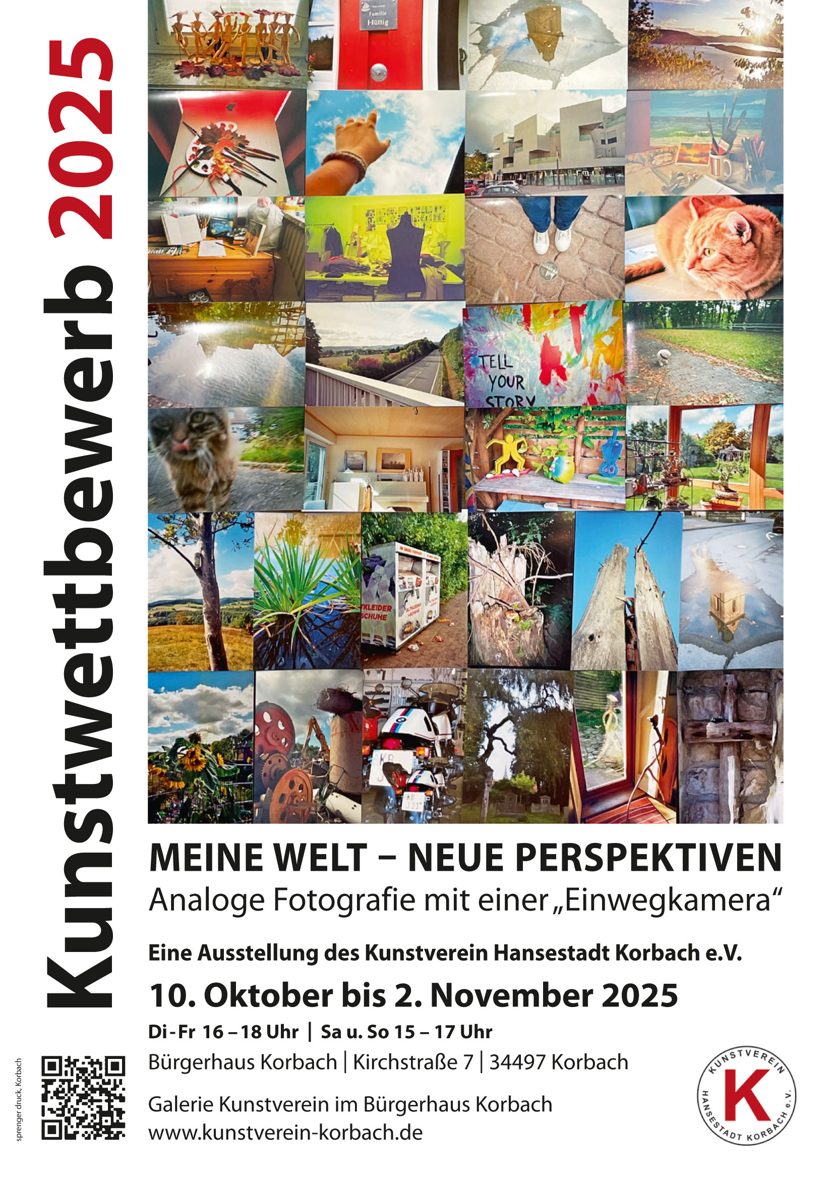 Zum Kunstwettbewerb 2025 hat der Kunstverein 100 Einwegkameras an Interessierte verteilt. Unter dem Motto „Meine Welt“ konnten damit neue Perspektiven entdeckt werden. Jeweils eine Fotografie wurde dann eingereicht und kann ab dem 10.10. in einer Ausstellung in der Galerie betrachtet werden. Am 10.10. um 18 Uhr wird die Ausstellung mit einer Vernissage eröffnet.